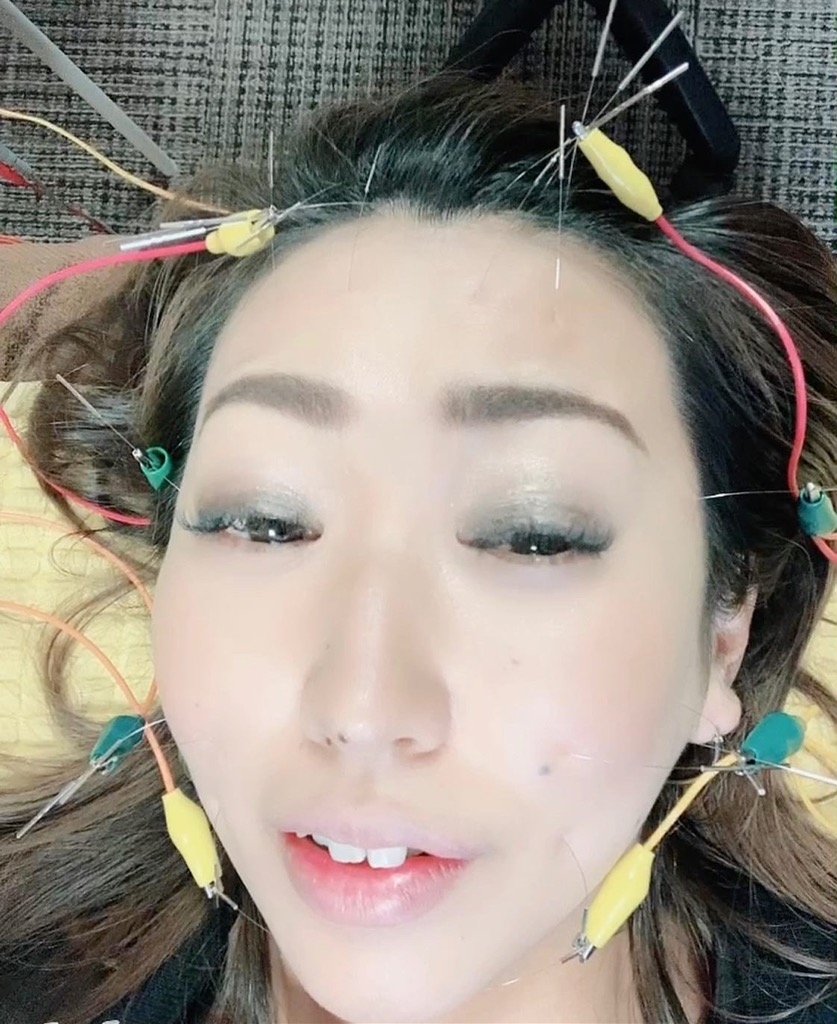 電気を流してくれる美容鍼なんで、顔が動く動く!