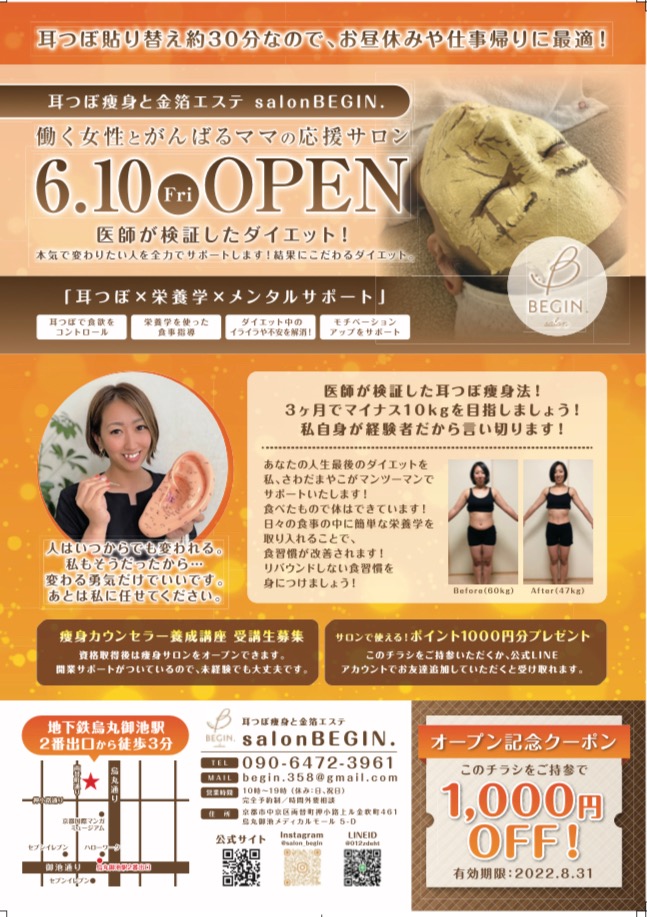 来る6月10日、中京区に耳つぼ痩身と金箔エステができる「salon BEGIN.」2店舗目をオープンいたします!